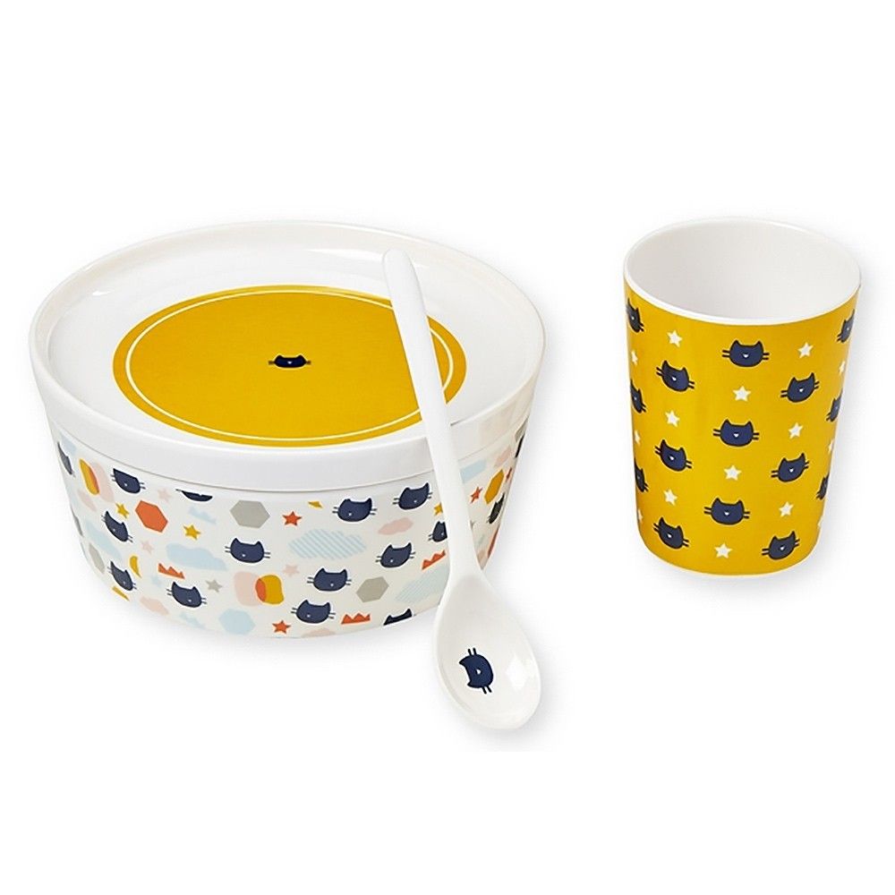 Composé d’une assiette, d’un bol, d’un verre et d’une cuillère, ce kit aux motifs chats est ludique et amusant pour les plus petits.