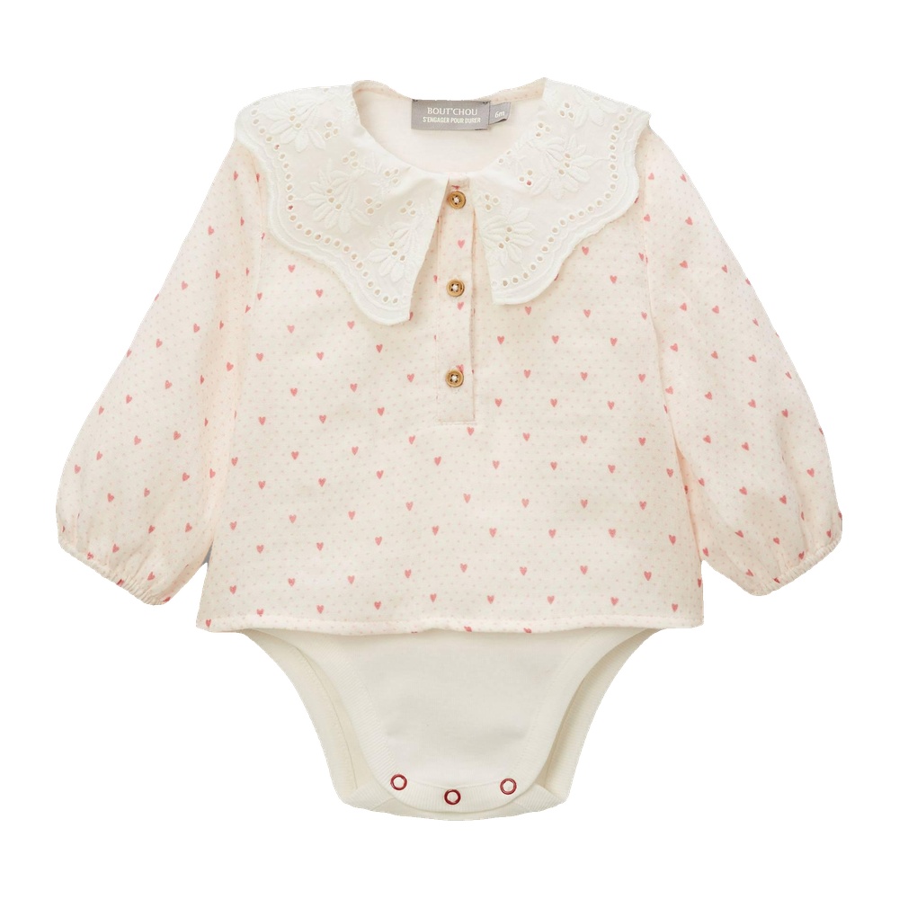 Ce body blouse associe une gaze de coton douce à un col fantaisie en broderie anglaise.