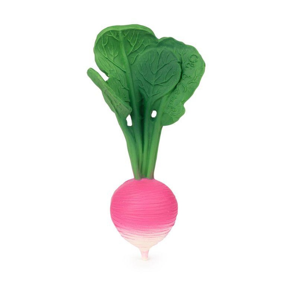 Anneau de dentition en forme de radis, fabriqué en caoutchouc naturel issu de la sève d’hévéa.