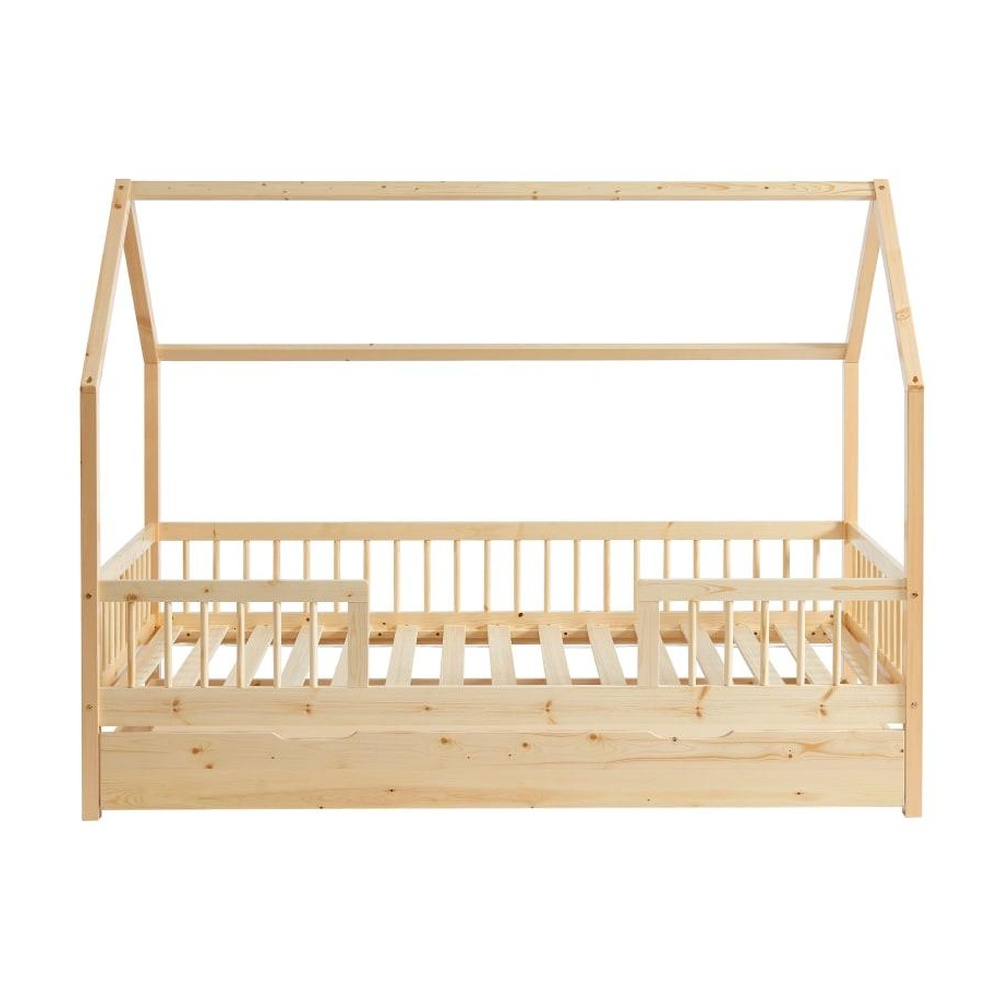 Les barrières intégrées sécurisent le couchage et permettent des nuits paisibles. Un grand tiroir de rangement situé sous le sommier offre un espace pratique pour les jouets, livres ou couvertures.