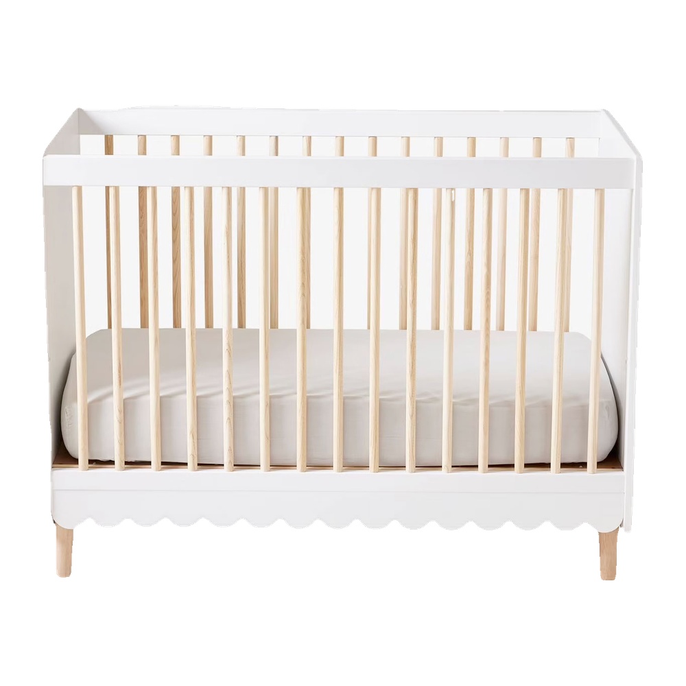 Ce lit évolutif accompagne la croissance de bébé en deux étapes, du lit à barreaux classique au lit banquette. Le sommier est réglable, avec une grande barrière à l’arrière et deux petites barrières à l’avant pour la version banquette. Les barreaux sont en frêne massif et les pieds en hévéa massif, avec des détails feston visibles. Conçu en panneaux de fibres de bois, il est livré à monter soi-même et conforme aux normes en vigueur.
