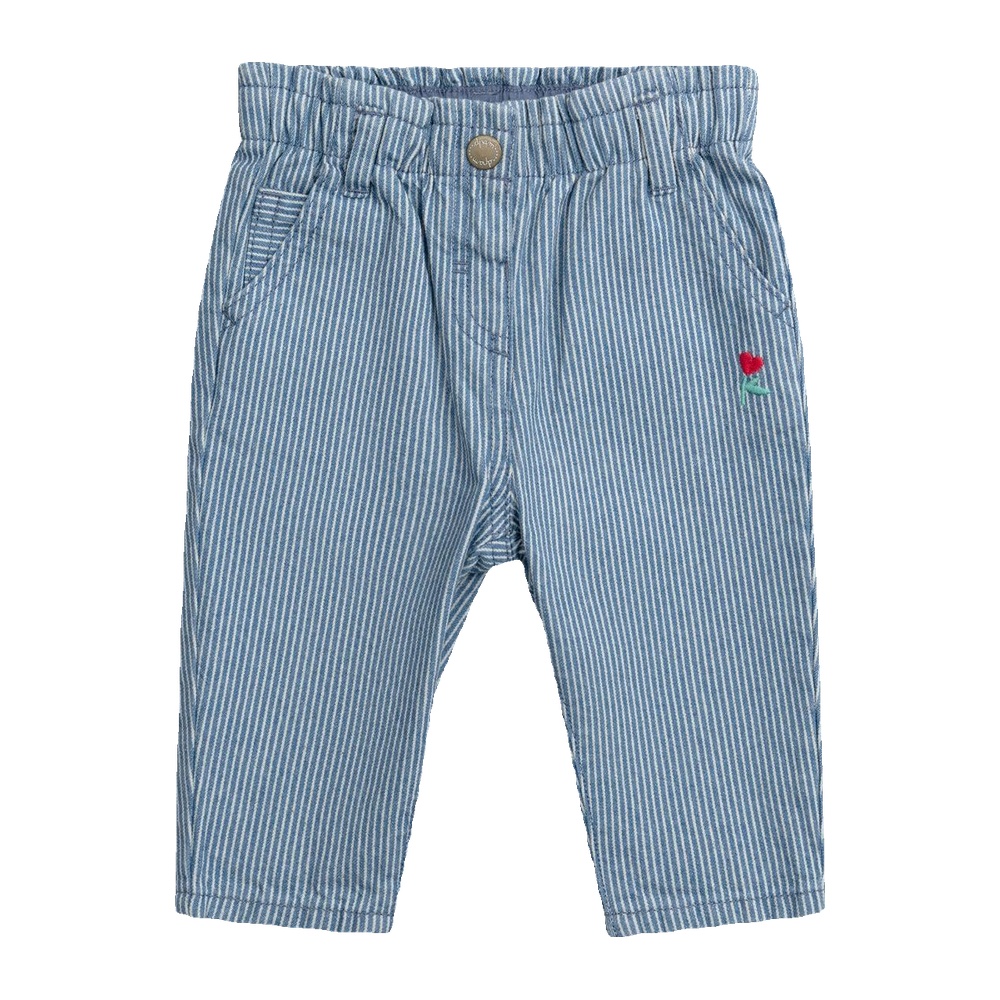 Apportez du confort et de la liberté de mouvement à votre bébé avec ce pantalon en denim rayé coton, un essentiel du vestiaire de bébé fille. Sa matière souple et résistante accompagne les jeux et les explorations du quotidien. La taille entièrement élastiquée avec élastique ajustable et le bouton-pression gravé facilitent l’habillage, tandis que les poches italiennes et la poche arrière ornée d’une broderie florale et cœur ajoutent une touche féminine et raffinée. Les rayures verticales allongent la silhouette et le bas de jambe retroussé apporte une note moderne.