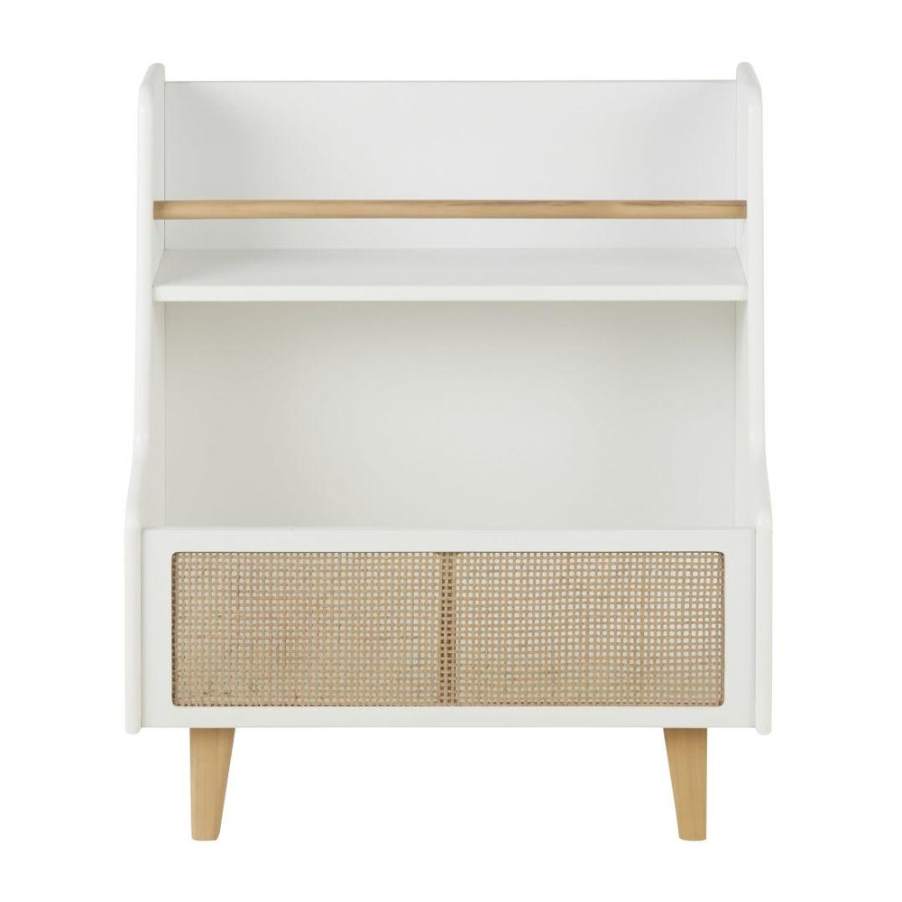 Ce range-livres bas associe une structure blanche à des éléments en bois et en cannage de rotin.