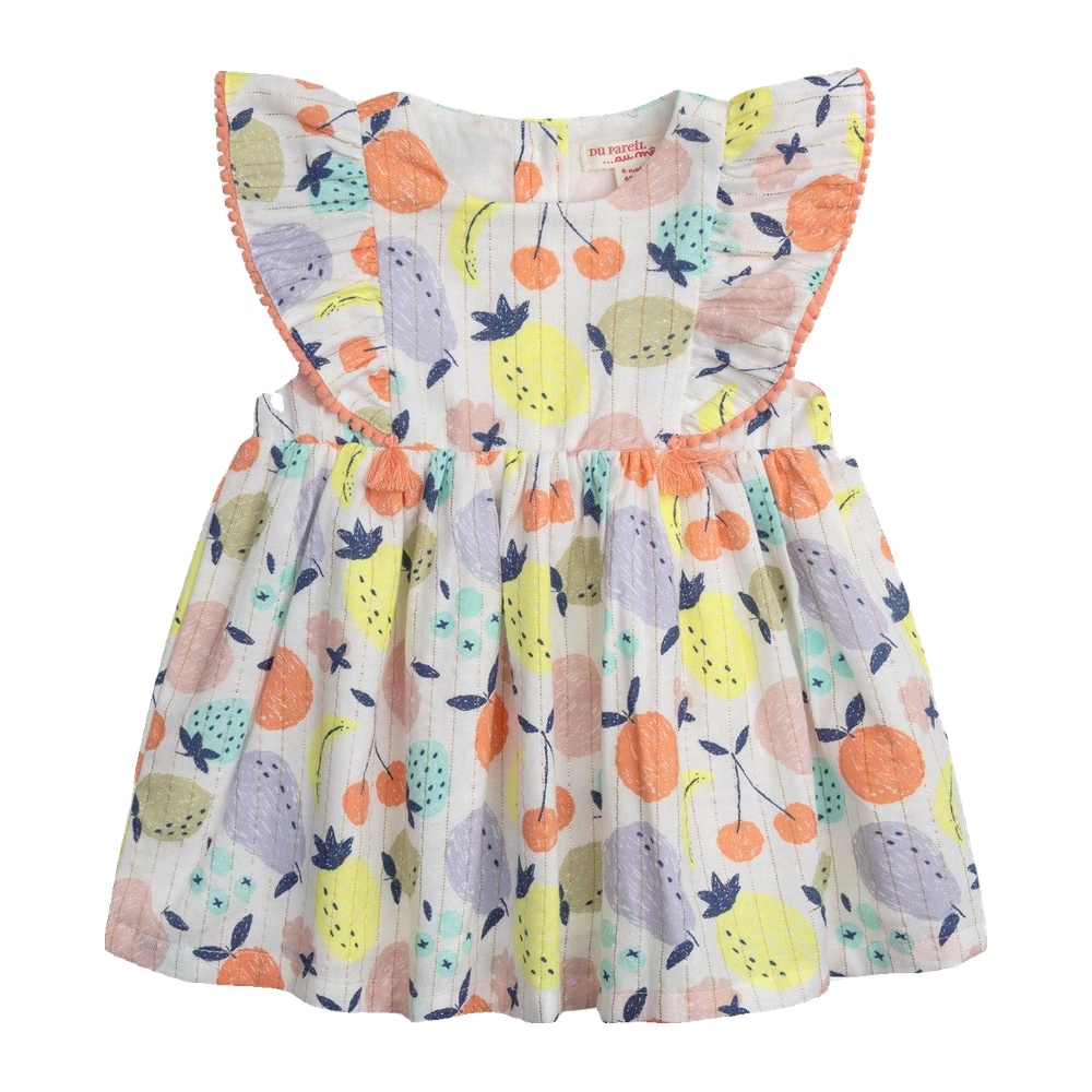 Cette robe imprimée fruitier allie douceur, confort et charme pour les journées ensoleillées. En matières légères et respirantes, elle respecte la peau sensible de votre bébé. Les fronces à la taille et les volants aux épaules apportent une touche délicate, tandis que l’ouverture au dos facilite l’habillage. Les finitions contrastées en tresse pompons abricot ajoutent un détail mode et raffiné.