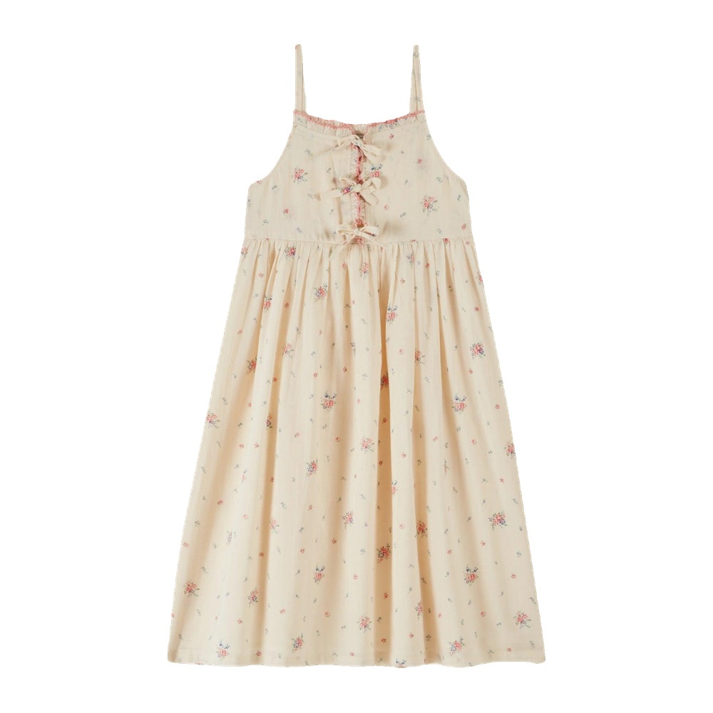 Robe enfant légère en voile de coton biologique écru, imprimée de bouquets et fleurettes roses.