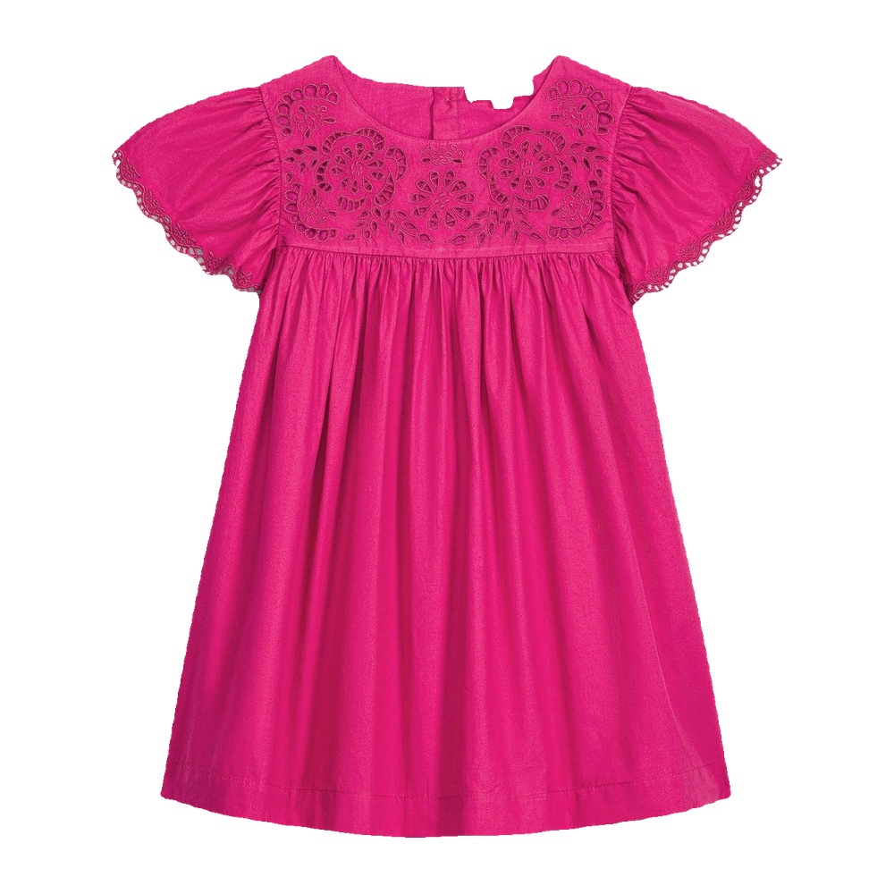 Cette robe unie en popeline de coton se distingue par un plastron délicatement orné de broderies ajourées.