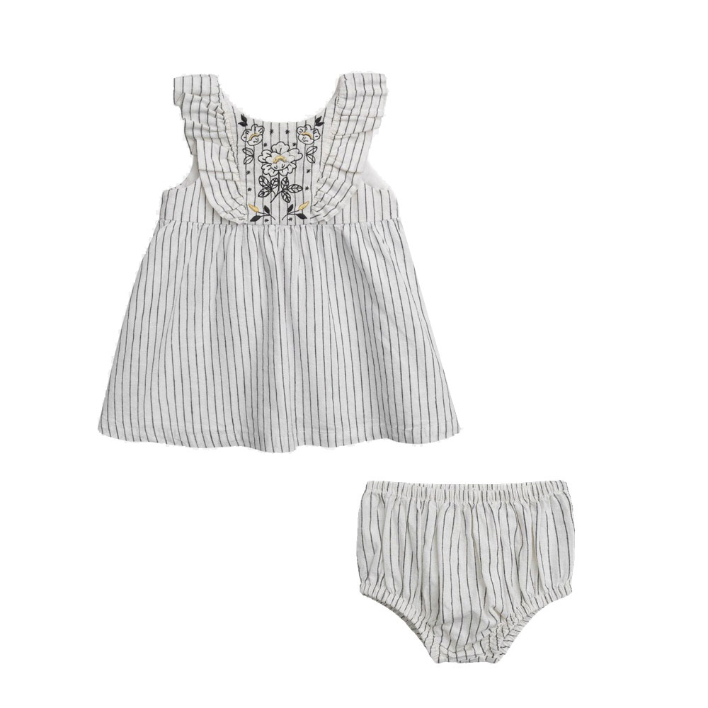 Chic et naturelle, cette robe à rayures Gris Cendre est idéale pour un été tout en élégance. En lin et coton doublés de voile de coton, elle est légère, respirante et agréable à porter même par fortes chaleurs. Les volants sur les emmanchures et le nœud fixe au dos apportent une touche raffinée à la silhouette. Pratique, elle est accompagnée d’un bloomer assorti à taille élastiquée et se ferme par un zip invisible au dos pour un habillage facile.