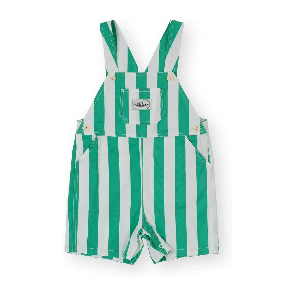 Salopette bébé estivale à rayures vertes et blanches, idéale pour les journées ensoleillées.