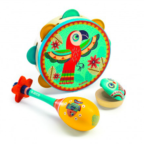 Tambourin, maracas et castagnette composent ce set musical en bois créé par la marque Djeco. Les trois instruments sont très colorés et chacun d'entre eux est décoré d'un animal : le perroquet pour le tambourin, le poisson pour les maracas.