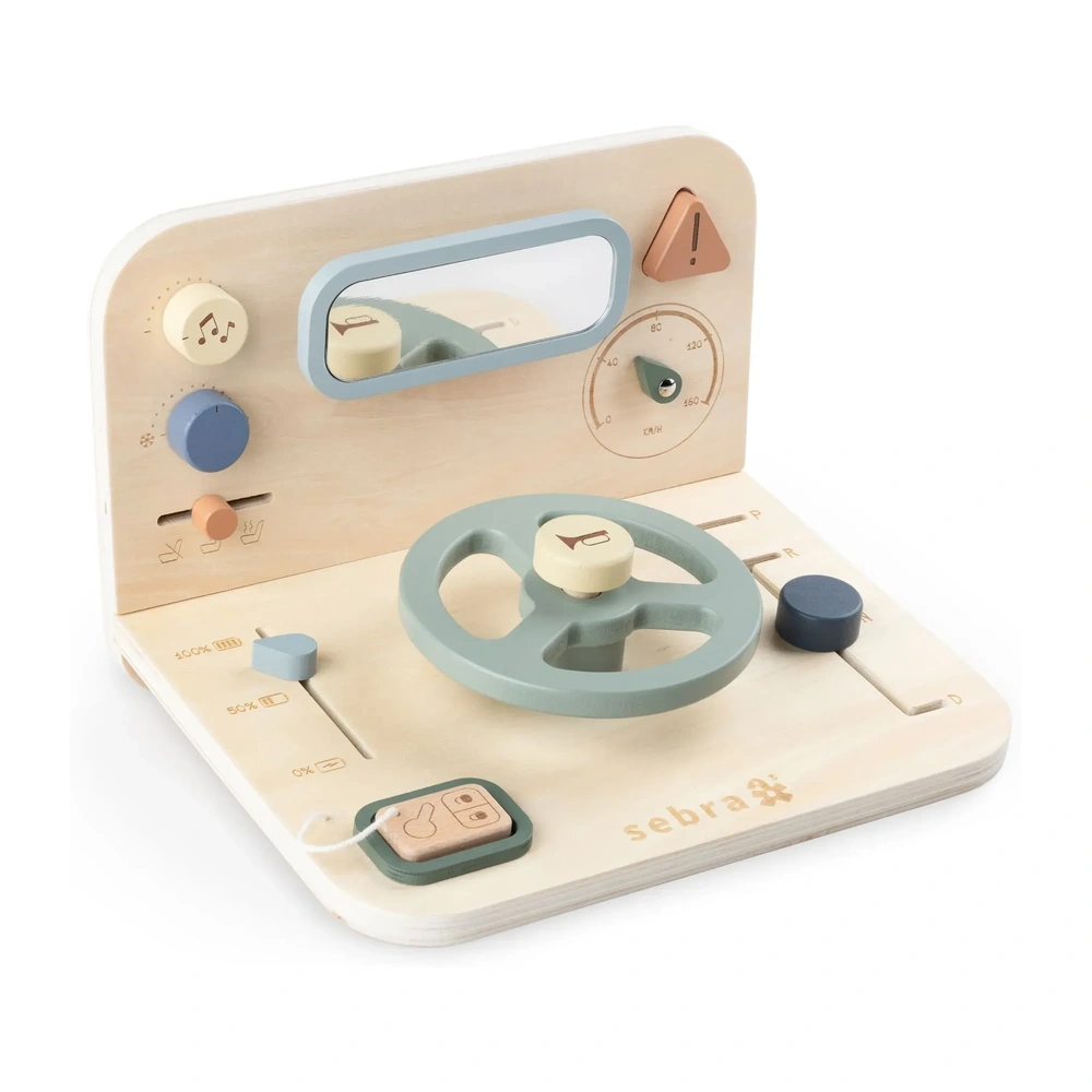 Inspirée d’une voiture moderne, cette table d’éveil invite l’enfant à tourner le volant, klaxonner, regarder dans le rétroviseur et explorer différents boutons.