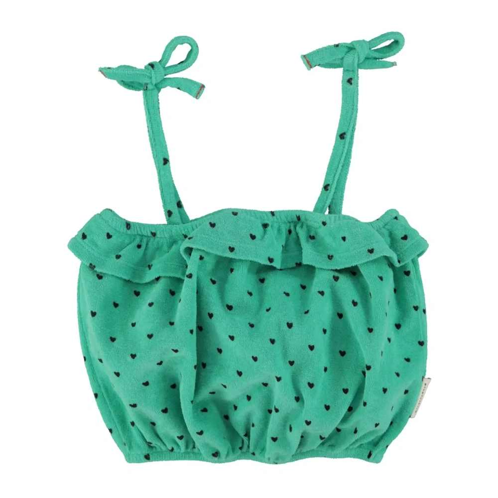 Top estival en coton éponge biologique, doux et respirant. Les bretelles fines, l’élastique et le volant sur la poitrine créent une silhouette légère et confortable.