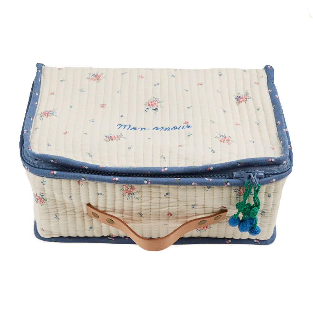 Valisette enfant en coton biologique écru à imprimé fleuri d’inspiration vintage, idéale pour transporter trésors, jouets ou affaires de voyage.