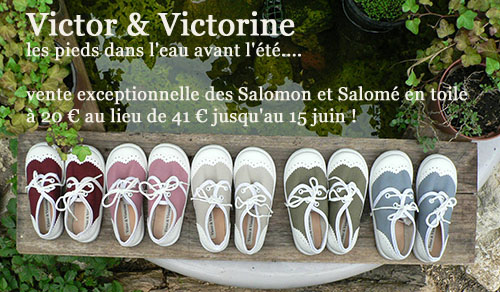Victor & Victorine vous propose ses Salomon et Salomé en toile à 20€ au lieu de 40€, l’occasion d’offrir à vos bambins de jolis souliers!