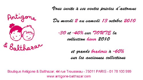 Vente privée Antigone & Balthazar Du 2 au 13 octobre 2010 Antigone & Balthazar vous invite à ses ventes privées d’automne du mardi 2 au samedi 13 octobre 2010