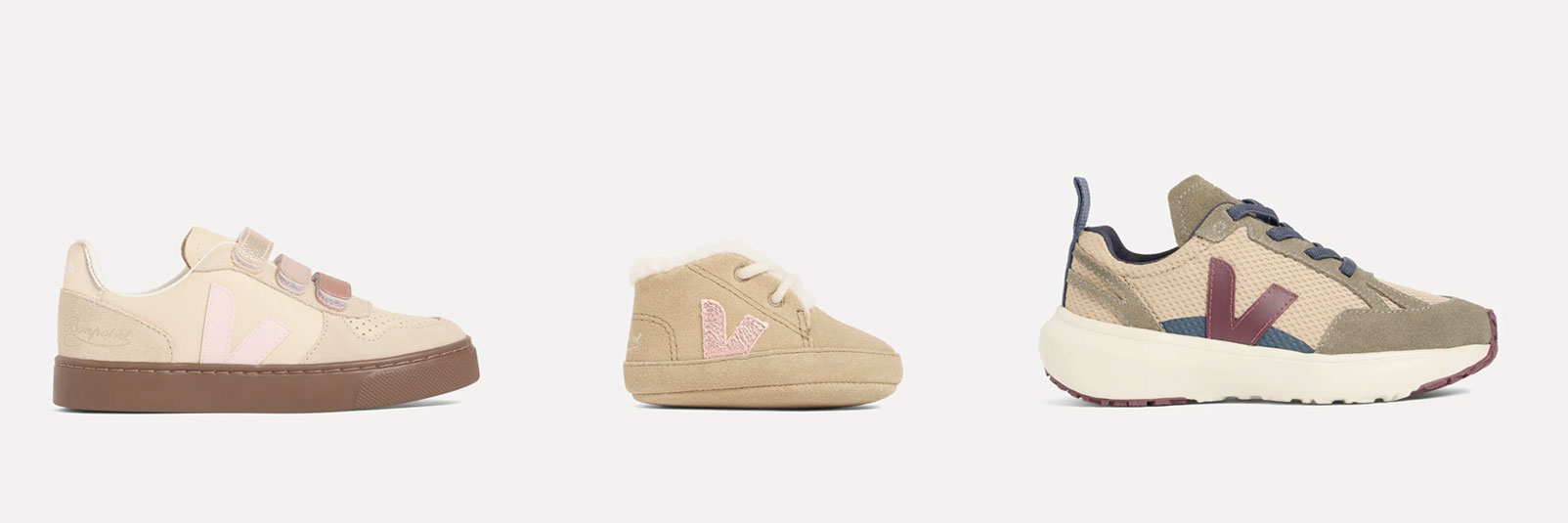 La capsule réunit trois modèles exclusifs pour enfants — Small V-10, Small Canary et Baby Winter — qui allient style, confort et exigence dans le choix des matières : cuir O.T. (Organic Traced), daim du sud du Brésil, alveomesh en fibres recyclées et polaire, idéale pour garder les petits pieds au chaud durant l’hiver.