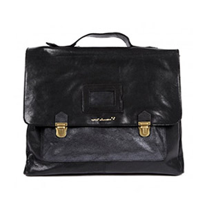 Grand rabat fermé par des clips, poignet sur le dessus, deux bretelles réglables, grande poche plaquée en cuir irisée noir sous le rabat, empiècement pour étiquette sur le rabat